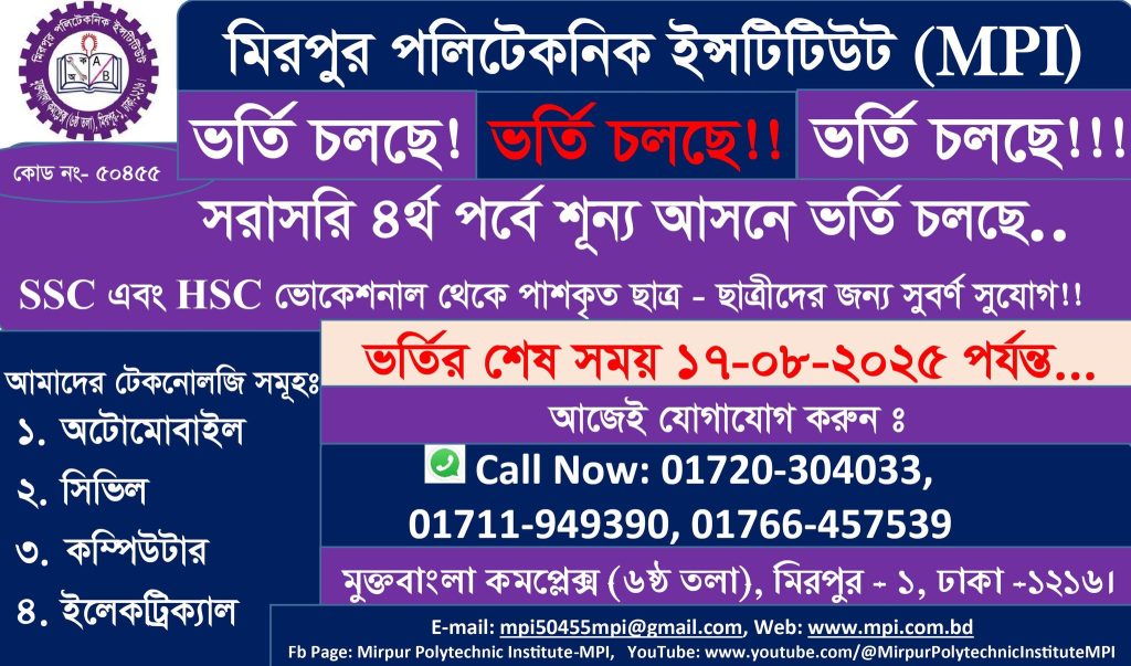 ৪র্থ পর্বে সরাসরি ডিপ্লোমা ইন ইঞ্জিনিয়ারিং এ ভর্তি চলছে ।